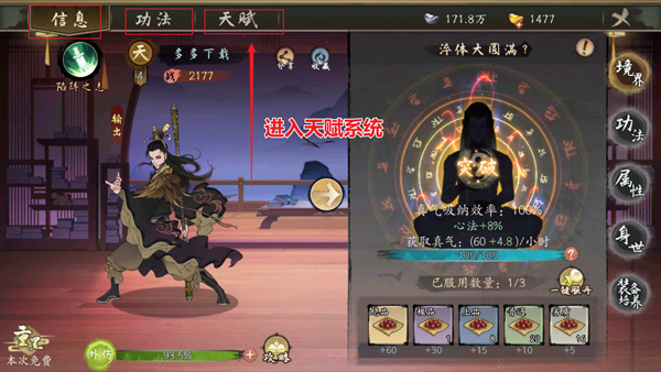 進入詳情頁后系統會給出三個功能,信息、功法以及天賦這里咱們選擇后者