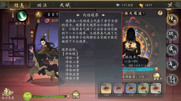 ps:當弟子在江湖世界中游歷時,他們的真氣會不斷上升。弟子領悟心法之后,心法的效果也會影響真氣的獲取速度。通過服用益氣丹也能增加弟子的真氣,但是在每一個小境界中,弟子們只能服用三回
