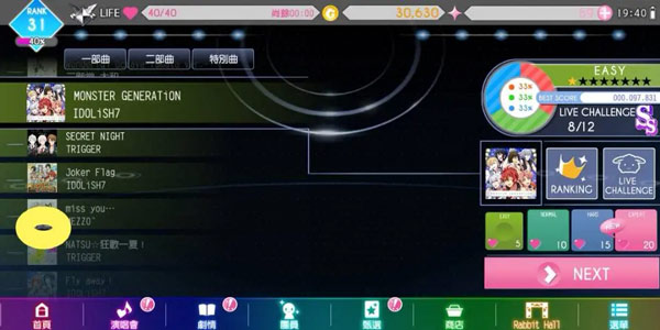 我們在主界面除了可以自由選擇歌曲外,還可以選擇歌曲的難易程度。愛娜娜的歌曲大體有四個難度,分別為【EASY】