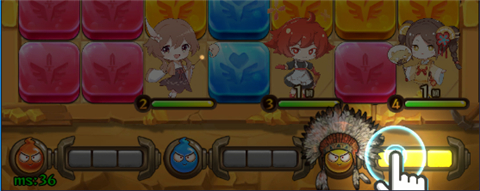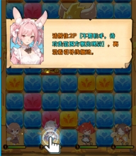 棋盤分布三種顏色色塊,每個色塊都具有能量值,連接色塊可以增加道具能量,角色移動破壞方塊后可以看到有黃色粒子匯聚到角色圖標上。看到連接色塊飛出的能量粒子了?這就是我們的技能能量條,能量條是根據玩家移動來獲取的,剛才行動后,黃色技能道具積存的能量已足夠我們使用,點擊看看。
