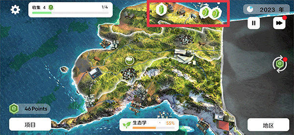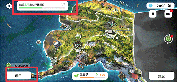 4、屏幕的左上角會(huì)顯示目標(biāo)任務(wù),按照要求完成目標(biāo)任務(wù),例如接受土地生態(tài)環(huán)保項(xiàng)目,點(diǎn)擊右下角項(xiàng)目