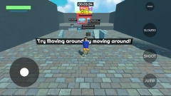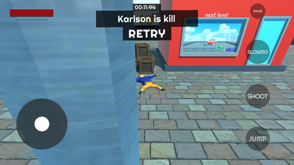 5、進(jìn)入游戲后畫面如圖所示,屏幕左側(cè)用于控制移動(dòng),右側(cè)則是攻擊、跳躍等按鍵。若能成功操控卡爾森抵達(dá)商店,便可進(jìn)入下一關(guān)。