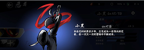 1、小黑是來自忍村的黑衣少年,立志成為一名偉大的忍者,在一次又一次的冒險中不斷成長,是游戲中最初始的人物
