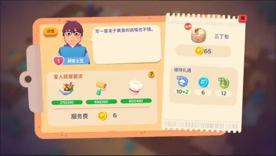 每接待1位普通顧客可獲得菜品售價、服務費、餐廳經驗等獎勵,建議保持餐廳中食材的充足。