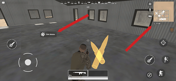 5、剛進入游戲的地方為我方區域,你可以根據地圖位置進行彈藥補給、使用汽車、補血等等,例如補彈藥,在彈藥位置后點擊get ammo即可補給