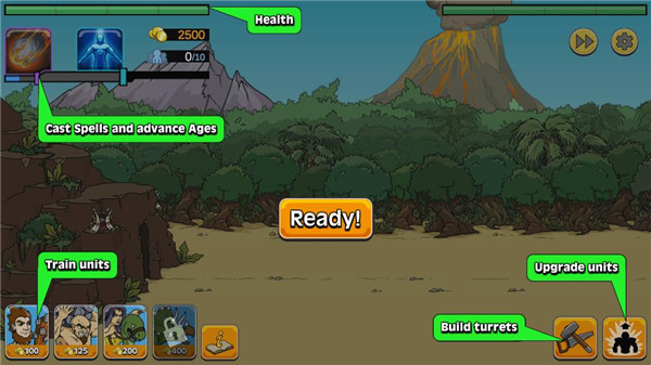 從山頂洞人騎著恐龍,在世界大戰中借助坦克訓練出一支龐大的軍隊!一路摧毀未來的機器人戰士!這里有眾多不同的單位可供訓練,時間跨度涵蓋7個截然不同的戰爭年代。多達29種單元類型任你調配,比如進攻型的斯巴達勇士、阿努比斯的戰士、法師、騎士、步兵炮、榴彈兵、機器人等等,還有更多!要是你覺得最強的進攻在于堅固的防御,那就嘗試堆疊一排炮塔,截斷敵人的攻勢!沒錯,我們依然有著名的雞塔,這可是必建的建筑。