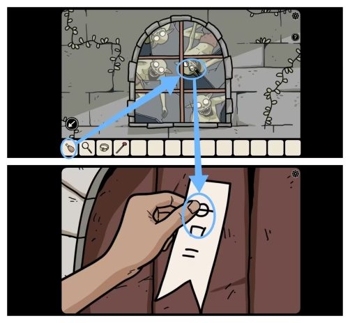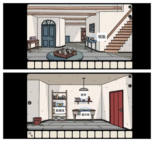 1、拿走相框背后的「生銹的鑰匙」,再到二樓右側(cè)拿走「數(shù)據(jù)線」、「膠帶」以及「提示紙」