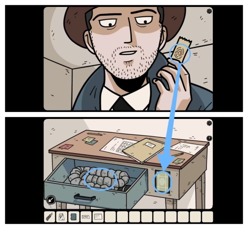 第二章1、從地道出來先往左走拿到「杠桿」,再進(jìn)入藍(lán)色門房間,按順序(如上圖)點(diǎn)擊右側(cè)的黑手打開箱子拿到里面的「戒指」與「舊鑰匙」。