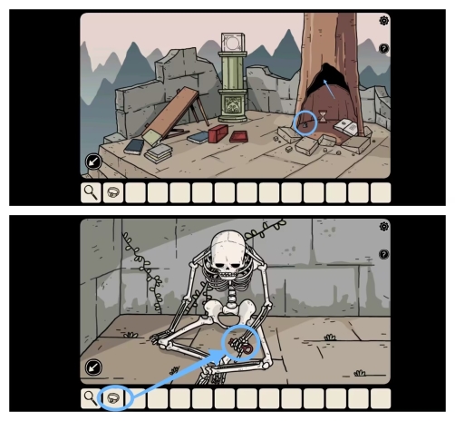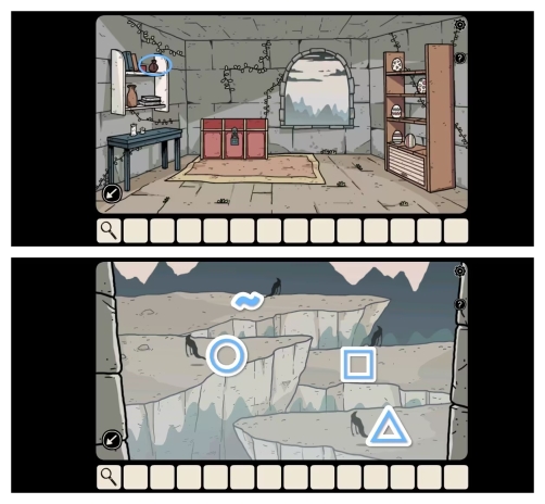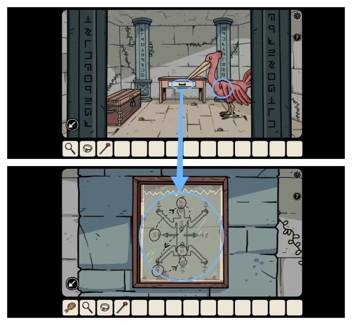 11、首先把沙子放進(jìn)山頂樹洞的沙漏里,之后用放大鏡觀察,從而獲取四個(gè)「符號(hào)密碼」。緊接著前往棕色房間,打開箱子,得到「鳥食」。隨后到二樓紅色房間,把「鳥食」喂給怪鳥,進(jìn)而獲得「鳥蛋」以及另外四個(gè)「符號(hào)密碼」。