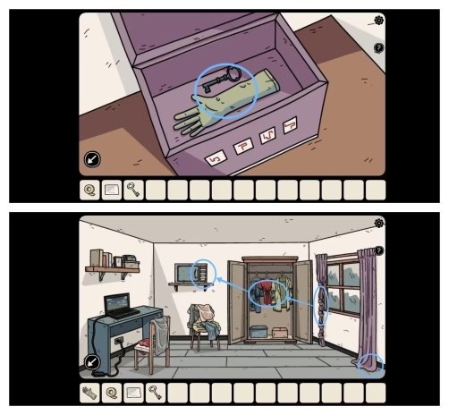 3、輸入由四個(gè)符號(hào)組成的密碼,打開客廳左側(cè)的紫色盒子,從中拿到「手套」與「藍(lán)色鑰匙」。隨后,用藍(lán)色鑰匙開啟二樓第一間房的房門。緊接著,仔細(xì)觀察衣服以及窗簾打結(jié)的數(shù)量,從而獲取密碼「1354」。最后,依據(jù)該密碼打開保險(xiǎn)箱,成功獲得「硬盤」。
