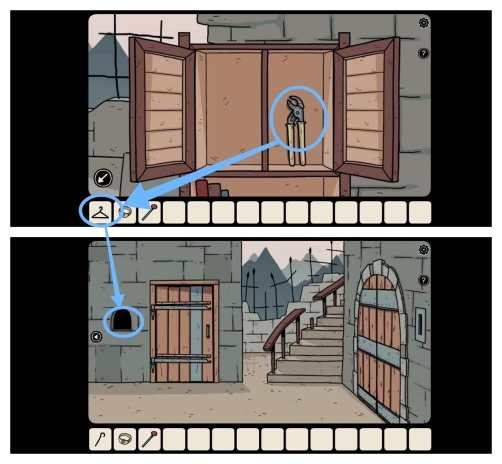 3、回到地道口,根據(jù)符號(hào)密碼打開右側(cè)的柜子拿到道具「斷線鉗」,再和衣架組合成「鉤子」打開右邊第一道門(如上圖)。