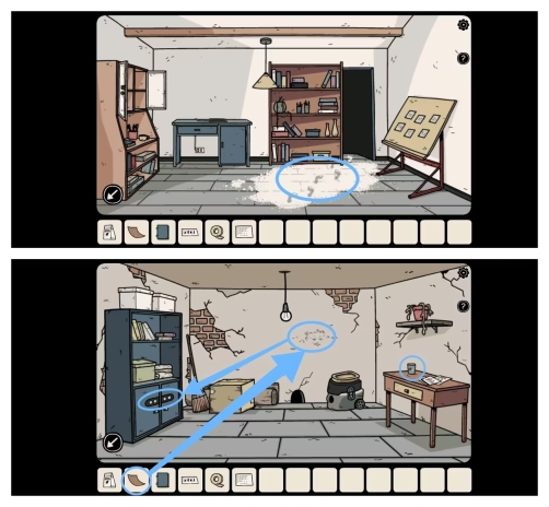 9、來到客廳觸發(fā)劇情進(jìn)入暗室,用砂紙清理墻壁上灰塵獲得四個(gè)「圖形密碼」,接著打開左邊的柜子拿到「毛刷」和「美工刀」