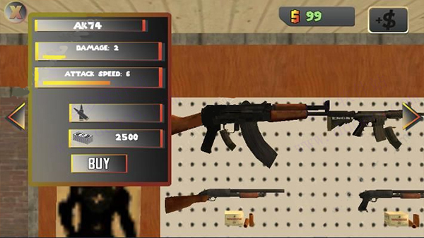 每種武器我們可以看到名稱、傷害、攻擊速度,子彈,價格,比如說AK74需要2500美金。